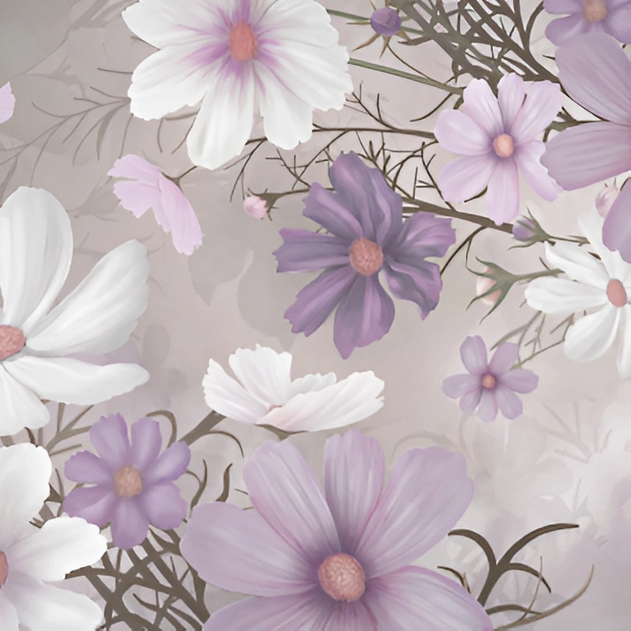 White and lilac flowers drift across a soft, hazy background, their petals opened by a gentle breeze. The pastel palette and painterly strokes create a soothing, feminine mural perfect for serene bedrooms and lounges.