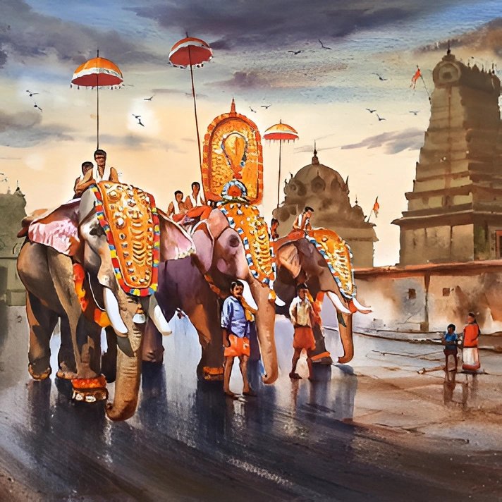 Majestic elephants, sacred streets, timeless devotion.