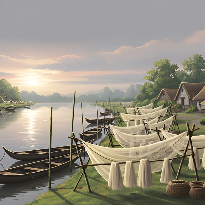 Fishing boats rest along a calm river as white nets dry in rows on the grassy bank. Soft dawn light, village homes and bamboo poles together create a peaceful scene of riverside life and simple industry.